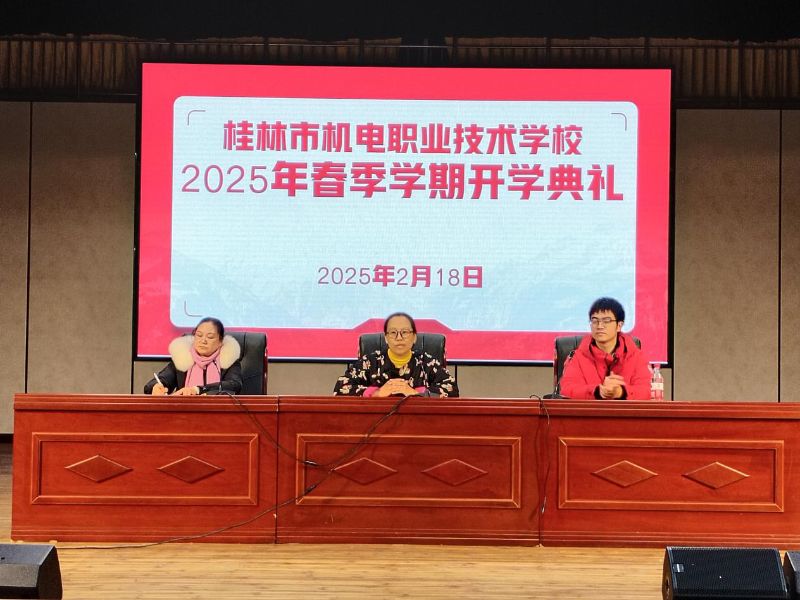 树目标、弘壮志——2025年春季学期开学典礼 踏着春天轻盈的脚步,合着新年欢快的节拍,怀着新年美好的憧憬,又迎来了新的学期。2月18日下午,桂林市机电职业技术学校全校师生欢聚在一起,三校区同时举行了2...